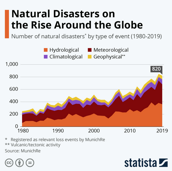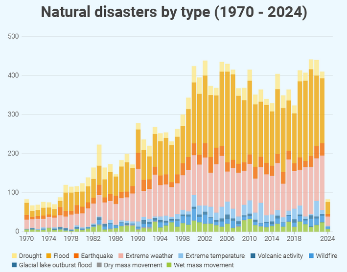 and cyclones across the world, with record setting storms in 2024. This follows the same pattern as the uptick in earthquakes since around